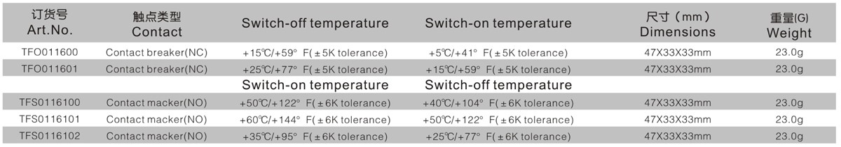 TF0 011:温度固定式温控器,当温度下降到某固定值时,TF0 011可启动加热器或开关信号装置